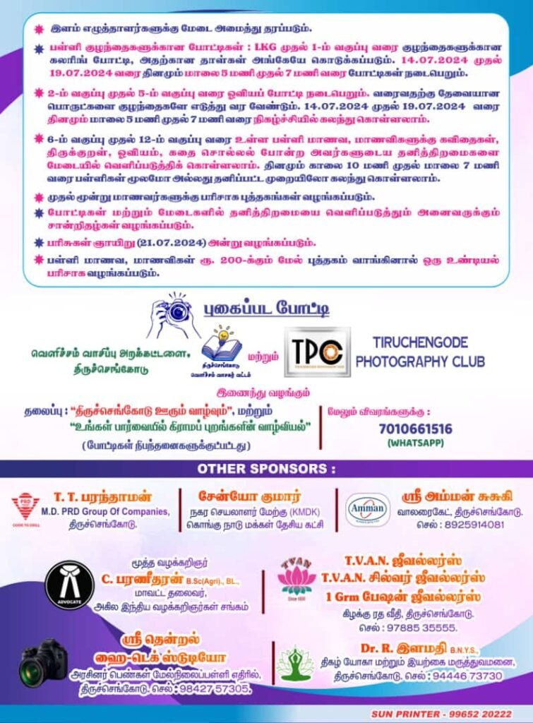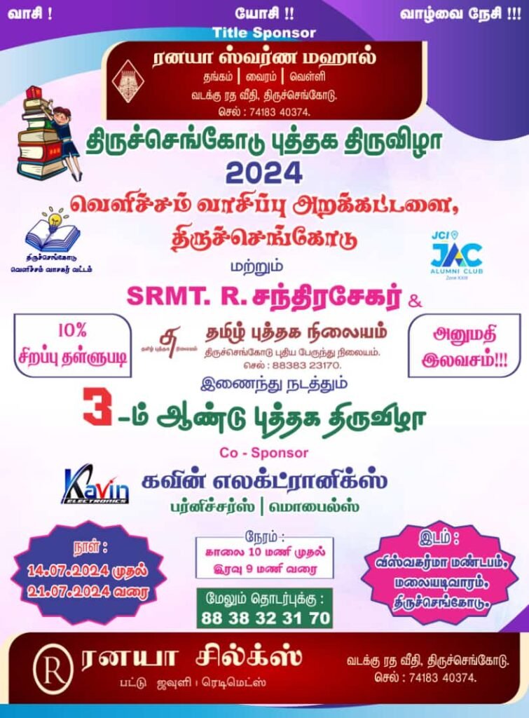 திருச்செங்கோட்டில் வெளிச்சம் வாசிப்பு அறக்கட்டளை, R சந்திரசேகர் மற்றும் தமிழ் புத்தக நிலையம் இணைந்து நடத்தும் 3-ஆம் ஆண்டு புத்தக திருவிழா இந்த மாதம் 14.07.2024 முதல் 21.07.2024 வரை மலையடிவாரத்தில் உள்ள விஸ்வகர்மா மண்டபத்தில் காலை 10 மணி முதல் இரவு 9 மணி வரை நடைபெற உள்ளது.